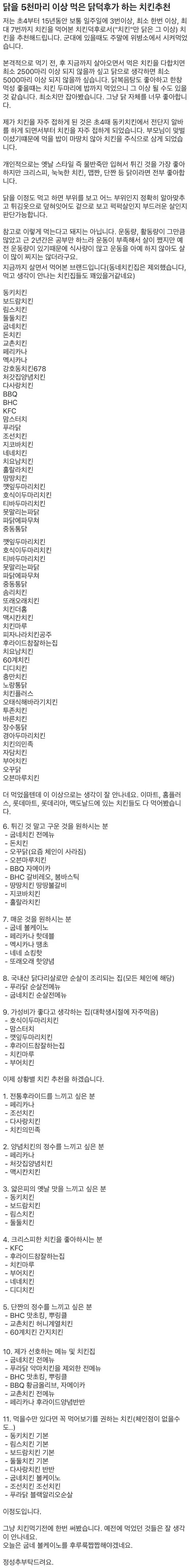 닭을 5천마리 이상 먹은 닭덕후의 치킨 추천글