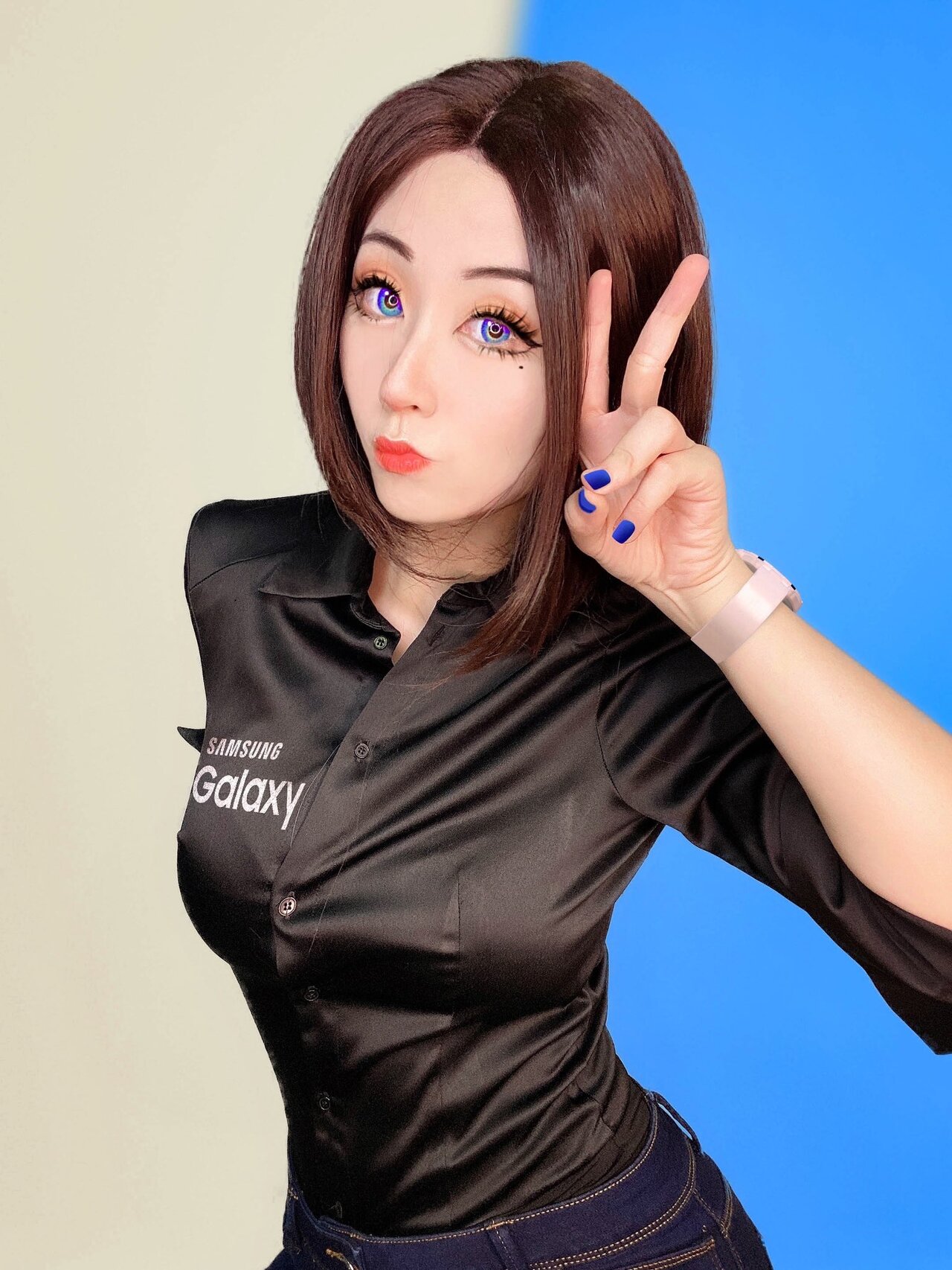 • 사진 설명: 삼성 샘의 아이콘 로고가 디자인된 흰색 블라우스와 청바지로 소박하면서도 세련된 삼성 샘 코스프레를 선보이는 모델의 사진이 포함되어 있습니다.