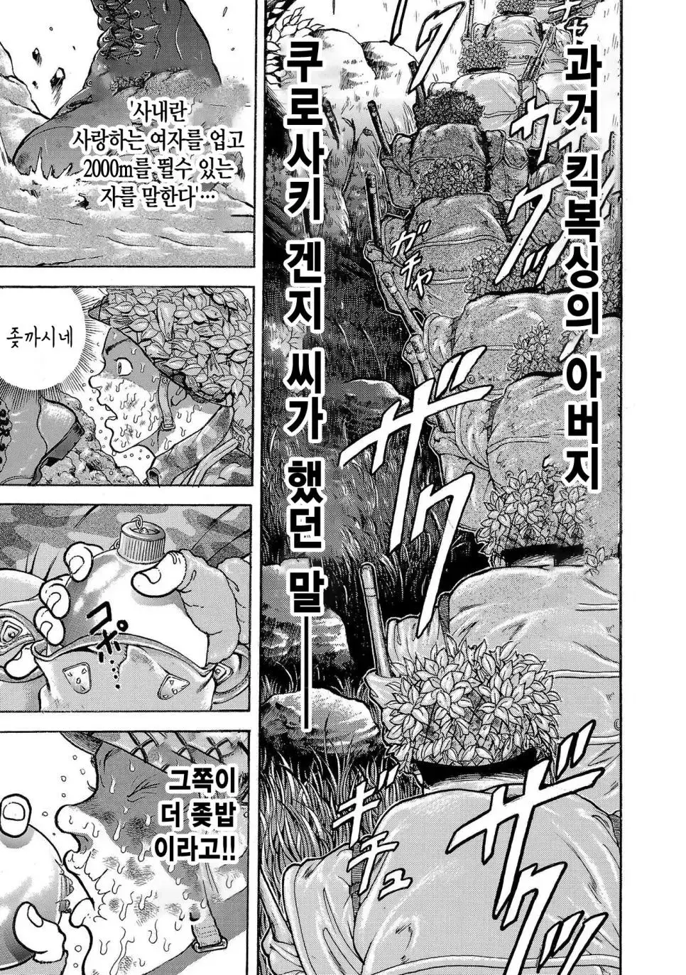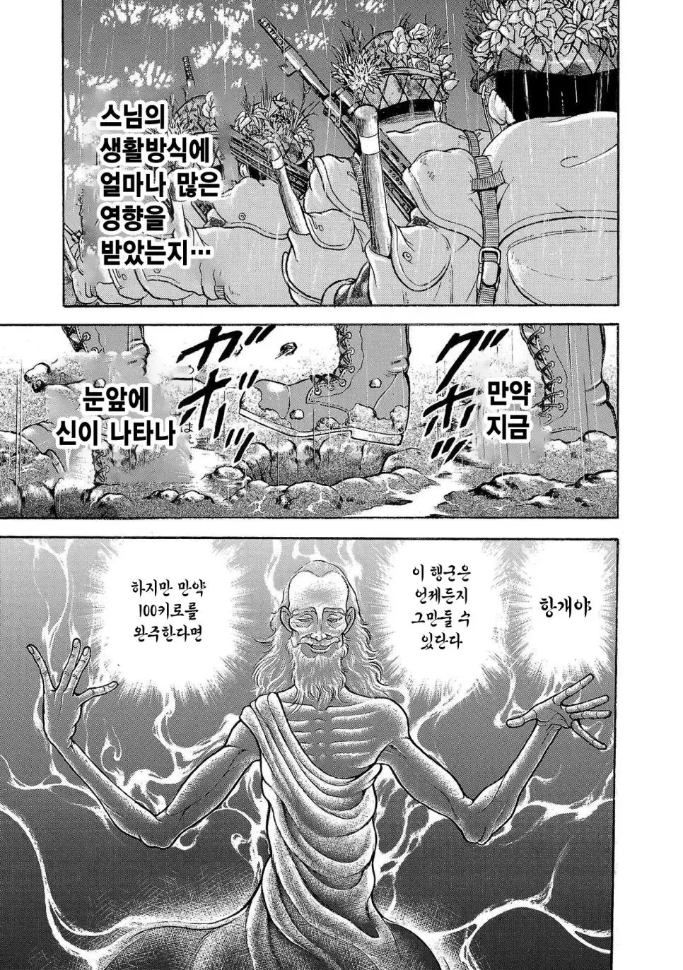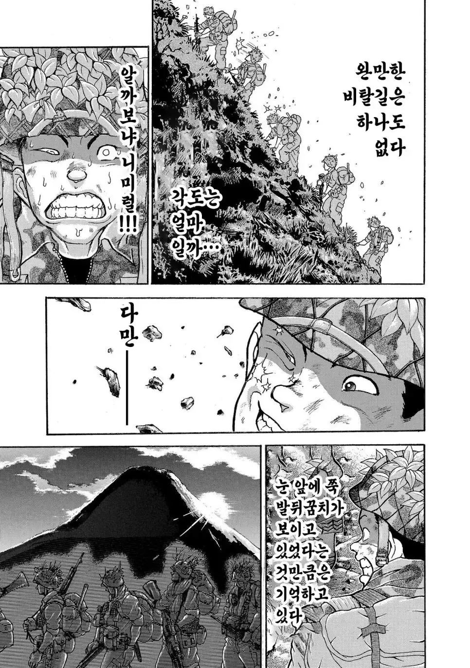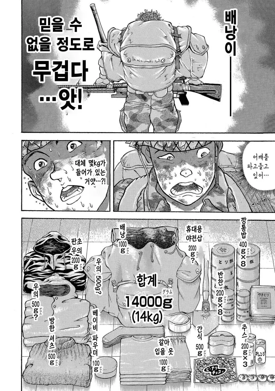 바키 작가의 그림을 통해 우리는 일본 육상자위대 제1공정단이 어떤 훈련을 받는지 볼 수 있습니다. 그들은 30kg의 군장을 메고 100km를 행군하는 엄청난 훈련을 받습니다. 이 훈련은 2박 3일 동안 이어지며, 행군하는 동안에는 총 2만 보를 걸어야 합니다.