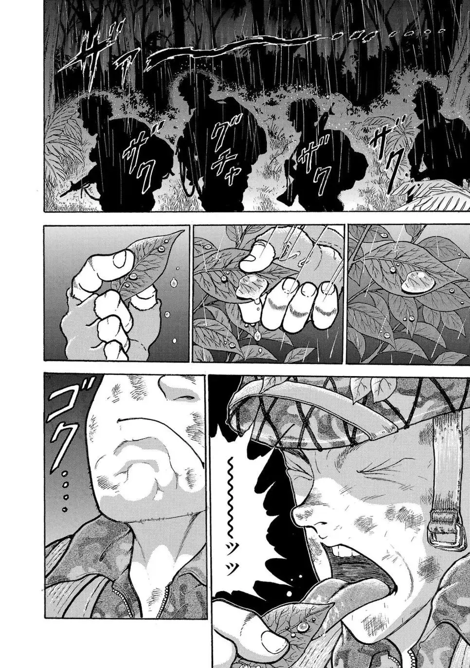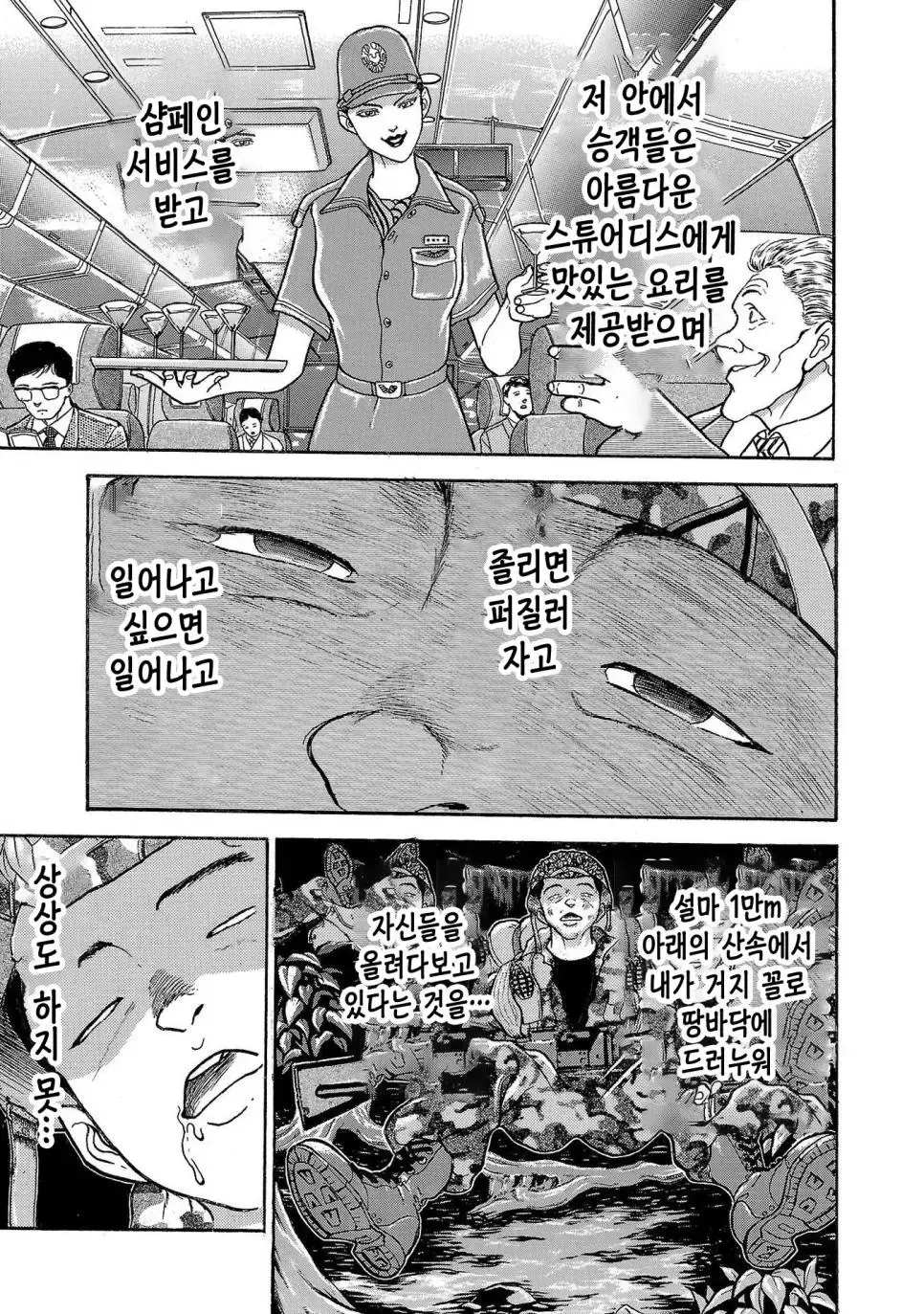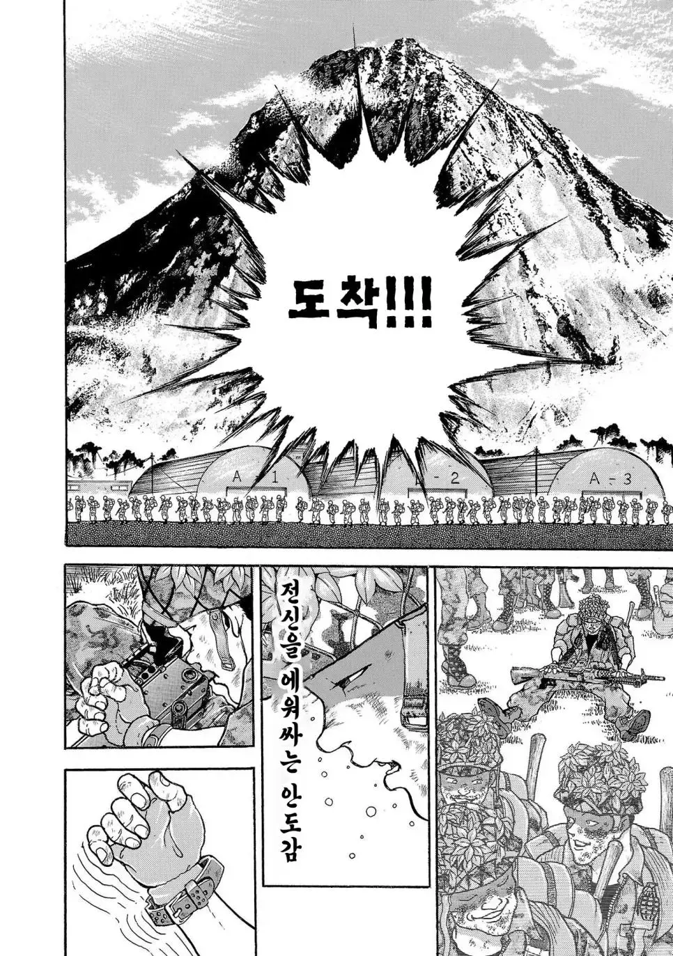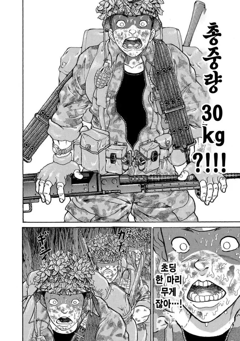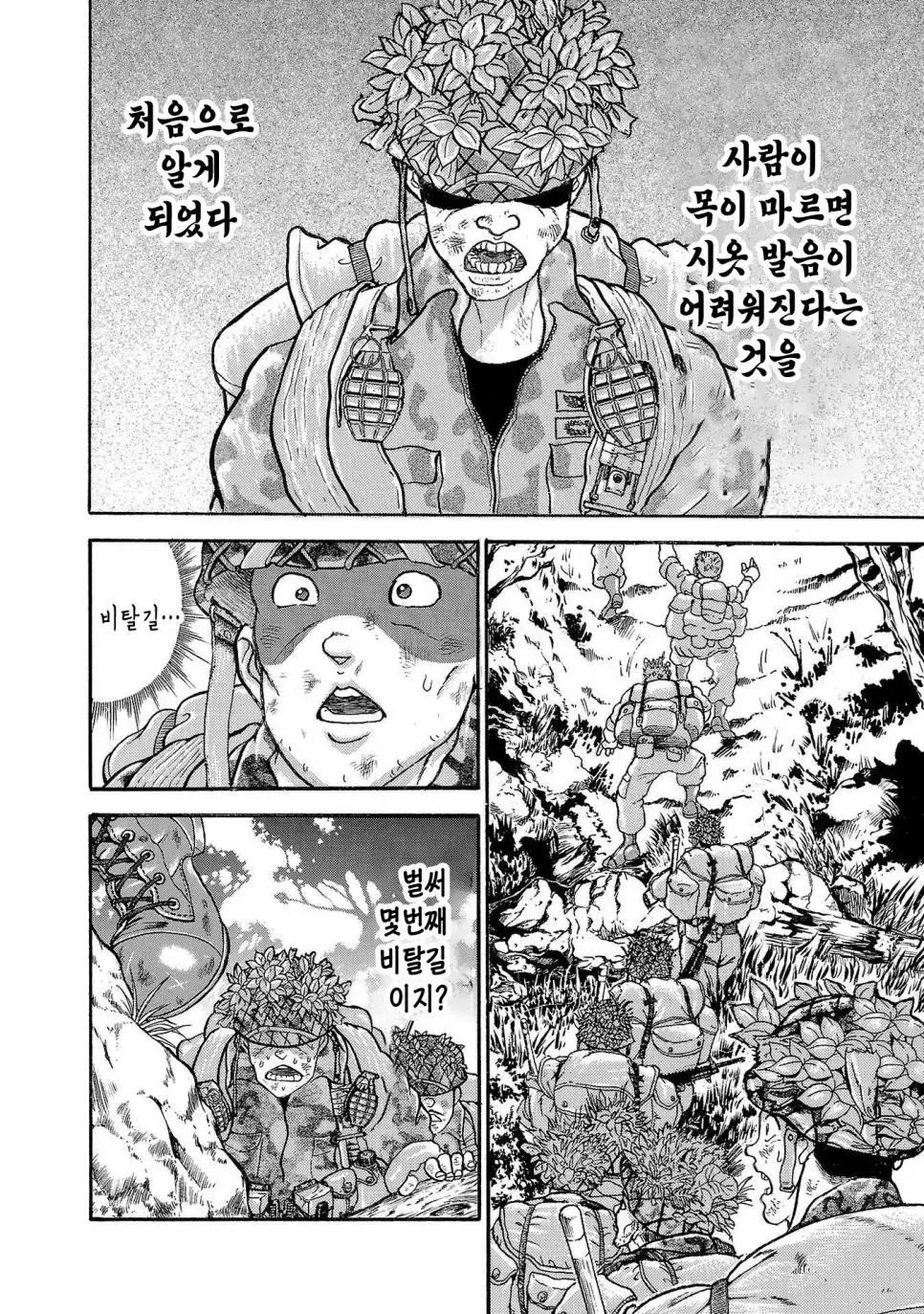 바키 작가의 그림을 통해 우리는 일본 육상자위대 제1공정단이 어떤 훈련을 받는지 볼 수 있습니다. 그들은 30kg의 군장을 메고 100km를 행군하는 엄청난 훈련을 받습니다. 이 훈련은 2박 3일 동안 이어지며, 행군하는 동안에는 총 2만 보를 걸어야 합니다.