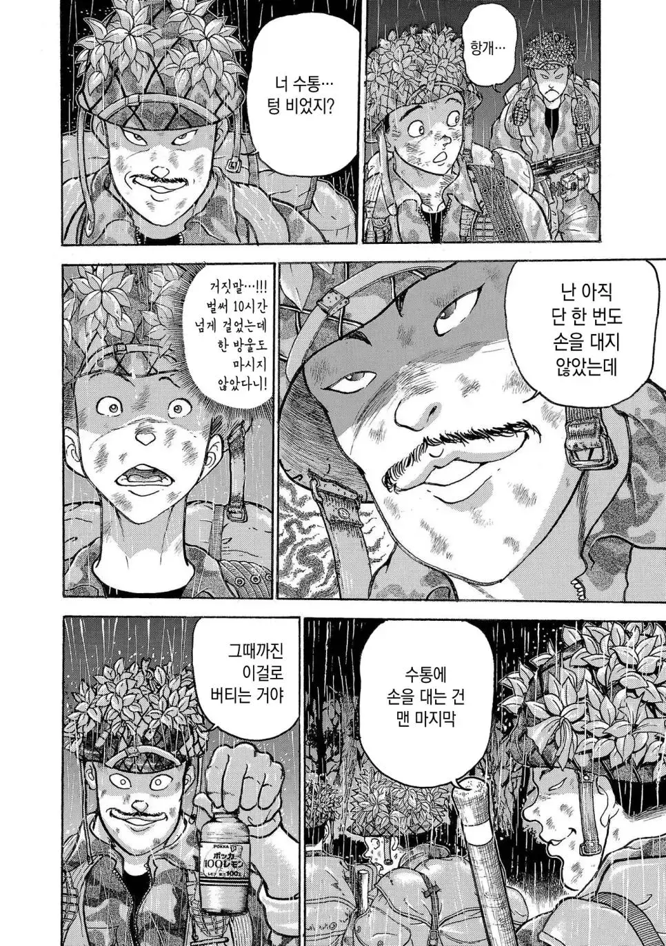 바키 작가의 그림을 통해 우리는 일본 육상자위대 제1공정단이 어떤 훈련을 받는지 볼 수 있습니다. 그들은 30kg의 군장을 메고 100km를 행군하는 엄청난 훈련을 받습니다. 이 훈련은 2박 3일 동안 이어지며, 행군하는 동안에는 총 2만 보를 걸어야 합니다.