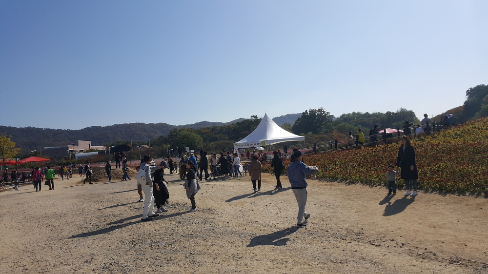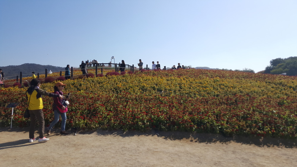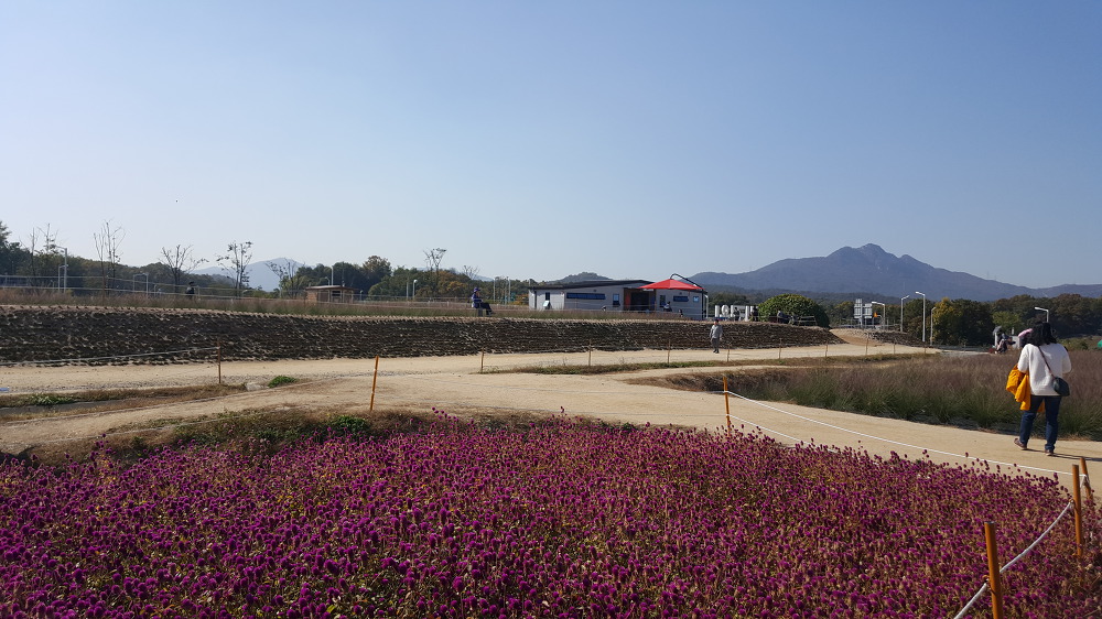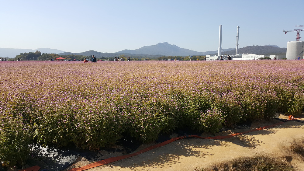 꽃밭 너머로 공장 굴뚝같은 것이 보이니 별로 보기 좋지는 않다.