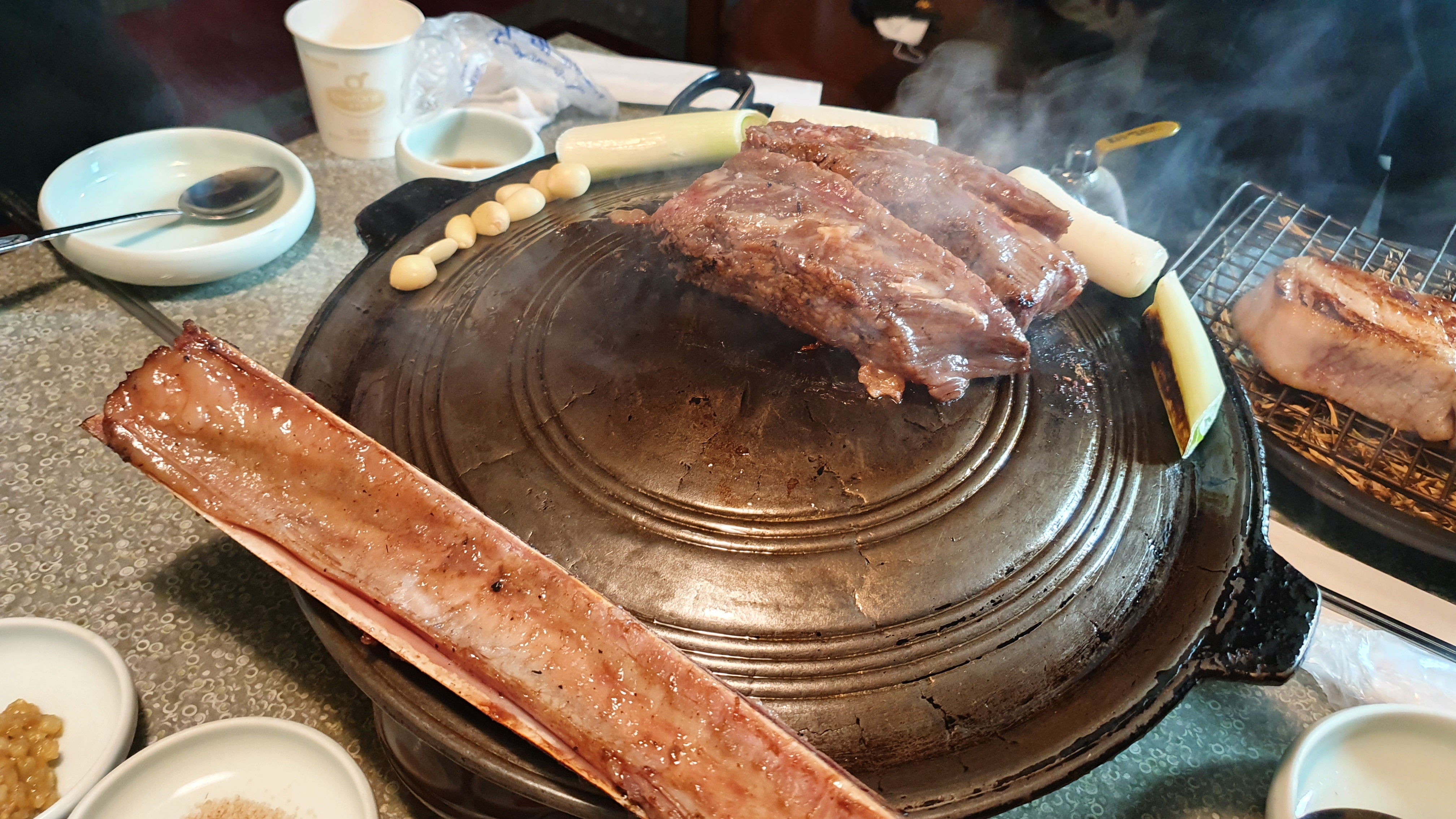 고기는 짚불로 구워져 나와서 연기 냄새가 은은하게 났는데, 이게 진짜 포인트였어요! 짚불 향이 고기와 어우러져 깊은 맛을 느낄 수 있었습니다. 고기는 두툼하고 촉촉하게 잘 구워져 나와서 다시한번 직원이 불판위에서 구워서 잘라줍니다. 역시 소고기 답게 입안에서 녹는 듯한 느낌이었어요. 갈비를 먹으면서 그 풍부한 맛과 향이 입 안 가득 퍼져 정말 만족스러웠습니다.