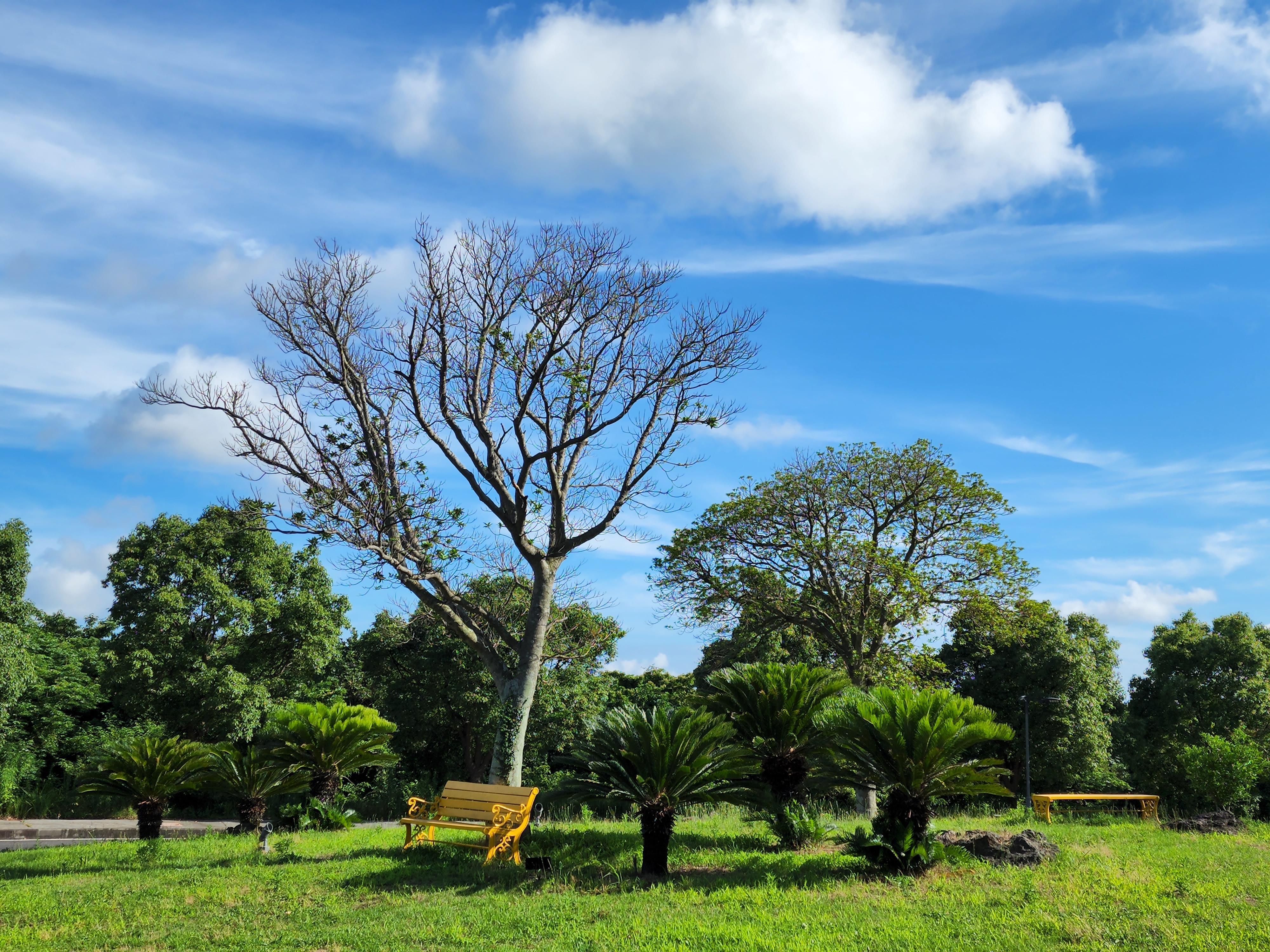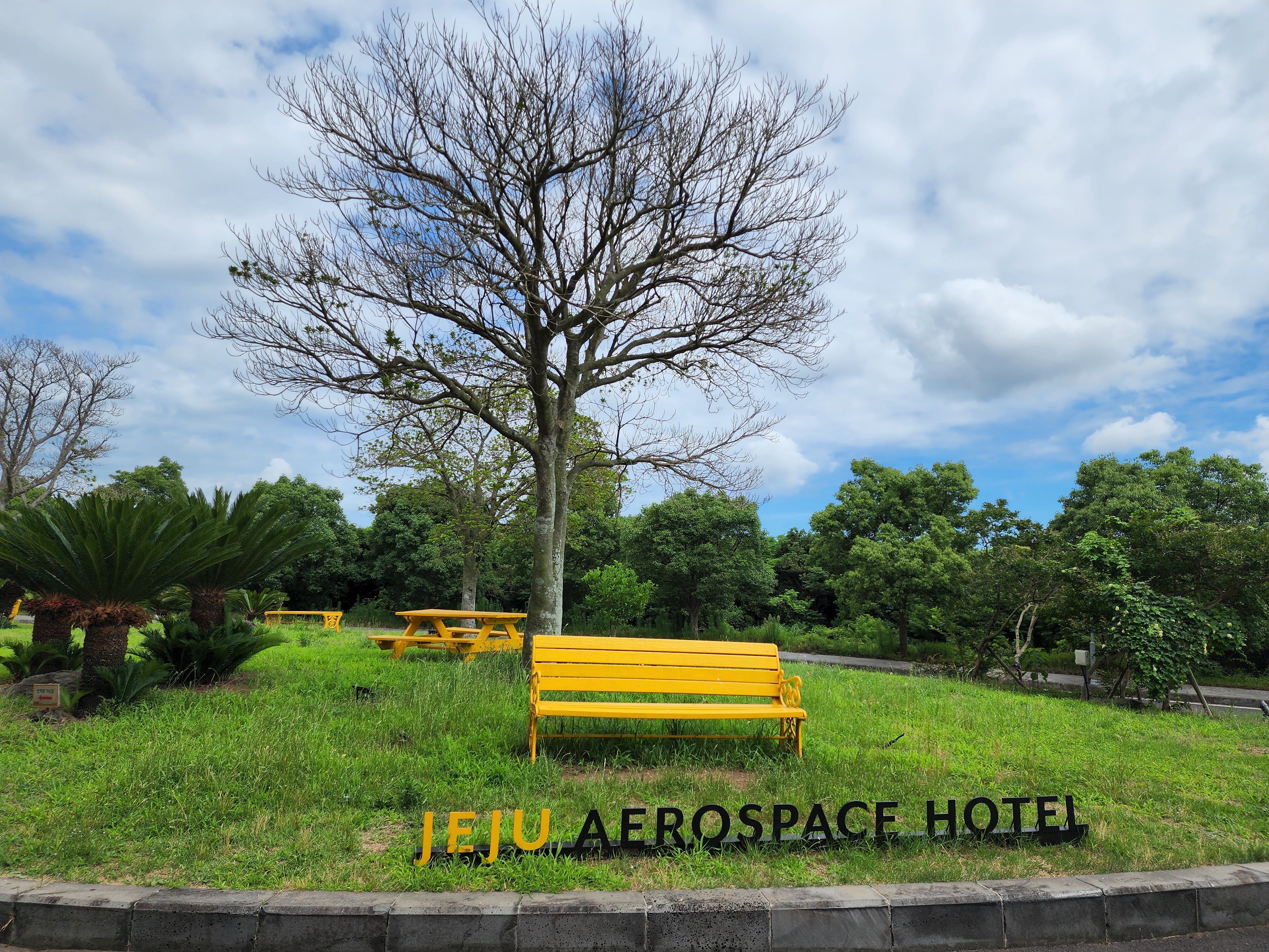 제주 항공우주 호텔의 정원은 조명을 활용하여 나무들을 아름답게 감싸고 있어 사진 찍기에 좋습니다. 사랑하는 친구와 함께한 여행에서 한라산 소주와 테라 쏘맥, 그리고 치킨으로 멋진 저녁을 즐겼습니다. 멋진 경치 아래에서의 시간은 로맨틱한 밤을 만들어주었습니다.