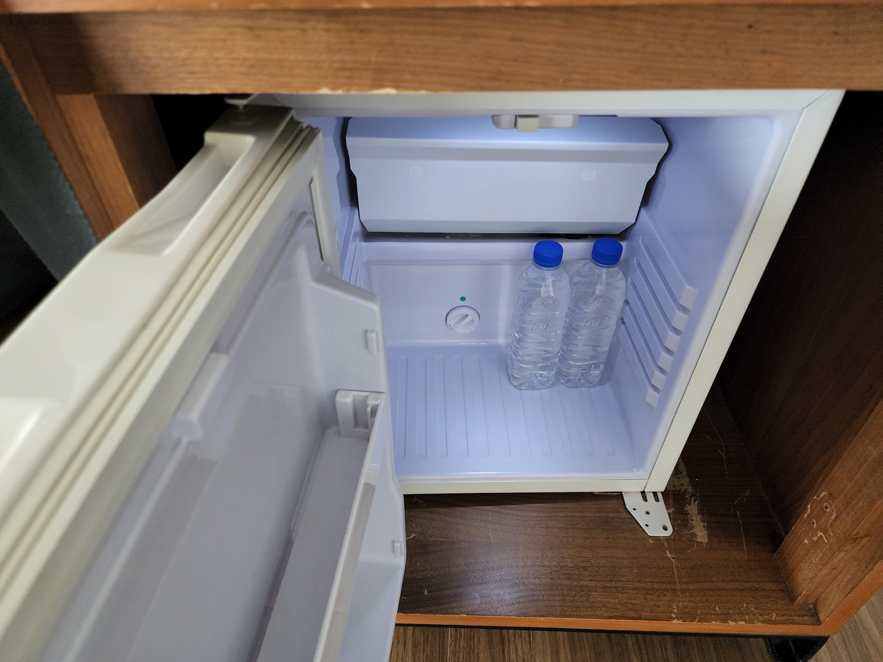 냉장고는 작지만 생수 2병을 제공합니다.
