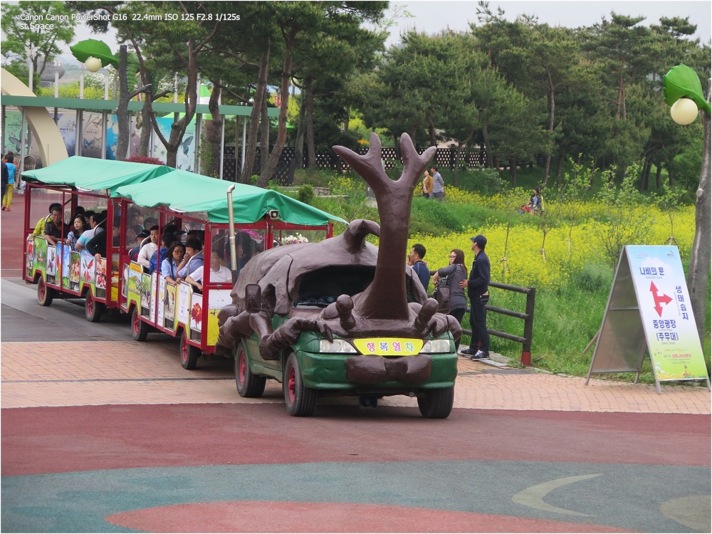 나비의 문을 지나니까, 무쏘 차량 같은 것에다가 FRP로 덧씌워서 수레를 끌고 다니는 행복열차를 운영하고 있다.
