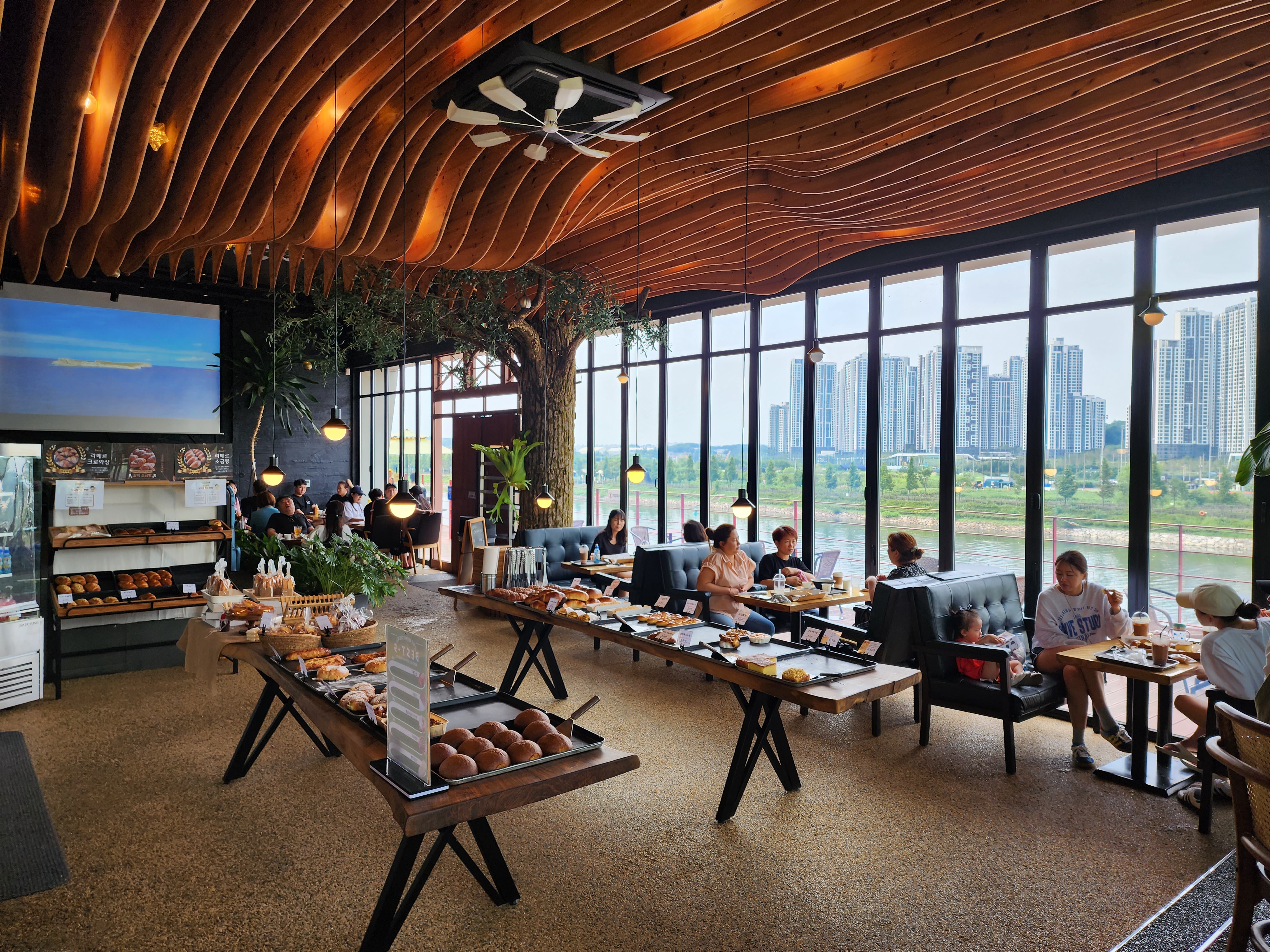 라메르 베이커리의 앞으로 펼쳐진 풍경은 멋진 아라뱃길을 바라보게 해주는데, 특히 날씨가 좋은 날에는 아름다운 풍경을 감상할 수 있습니다. 다소 햇빛이 강한 앞쪽 자리를 피해 사이드 자리나 실내 자리를 선호하는 분들도 많습니다.